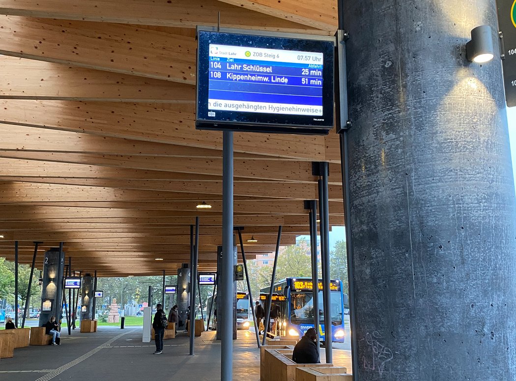 Digitale Haltestellenanzeiger im Zusammenspiel mit Echtzeitinformationen bieten eine erhebliche Verbesserung des Services für die Fahrgäste. Die Trapico betreibt bereits in einigen Städten und Landkreisen in Baden-Württemberg digitale Anzeiger. In Lahr/Schwarzwald wurden beispielsweise durch die Stadt an diversen Haltestellen hochauflösende TFT-Bildschirme installiert, deren digitale Oberfläche frei gestaltet werden kann. Dank der Technik lassen sich auch Grafiken und Sonderinformationen einspielen. Für sehbehinderte Menschen sind gelbe Vorlesetaster angebracht, über die sich der Bildschirminhalt ansagen lässt.